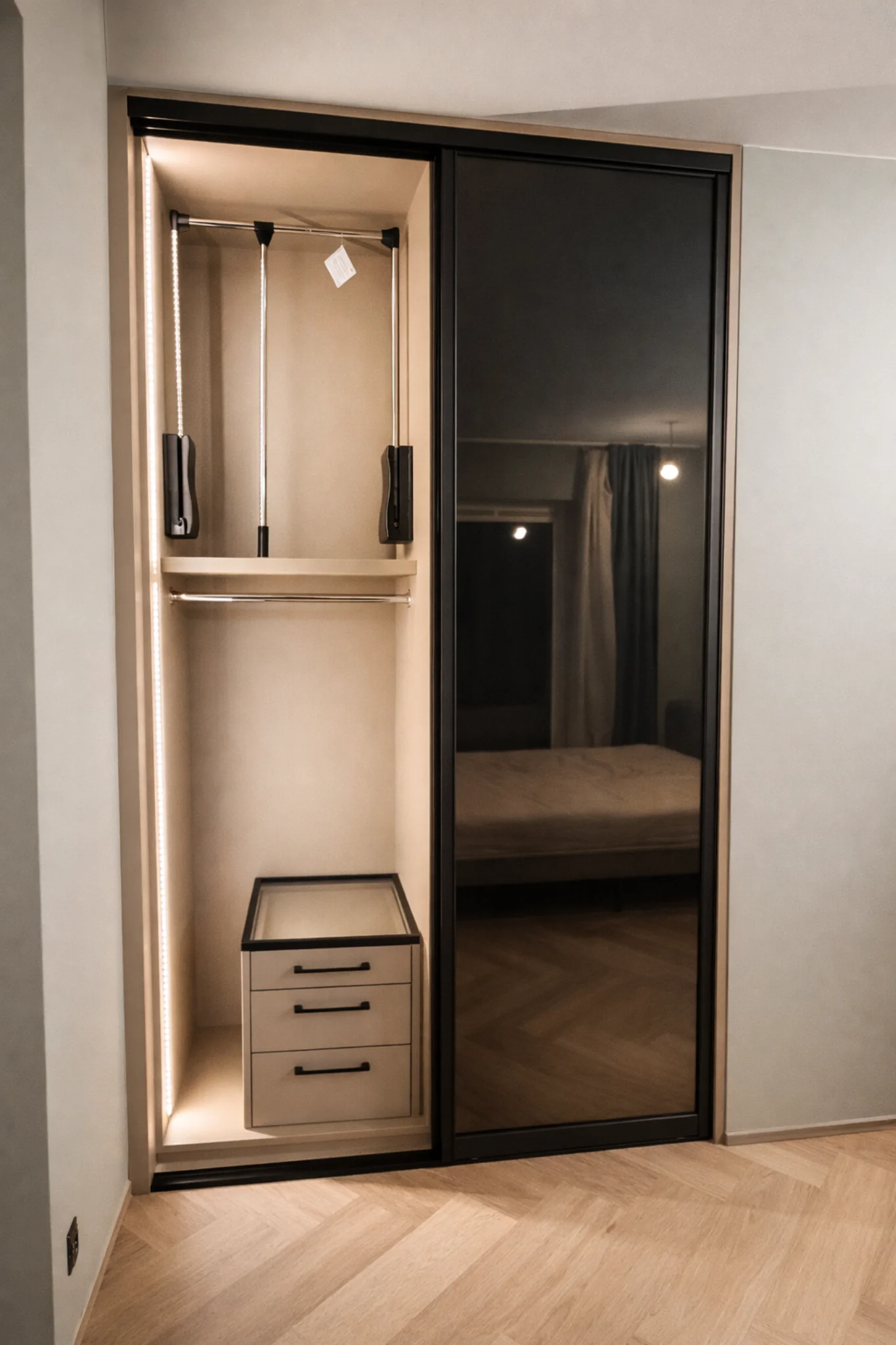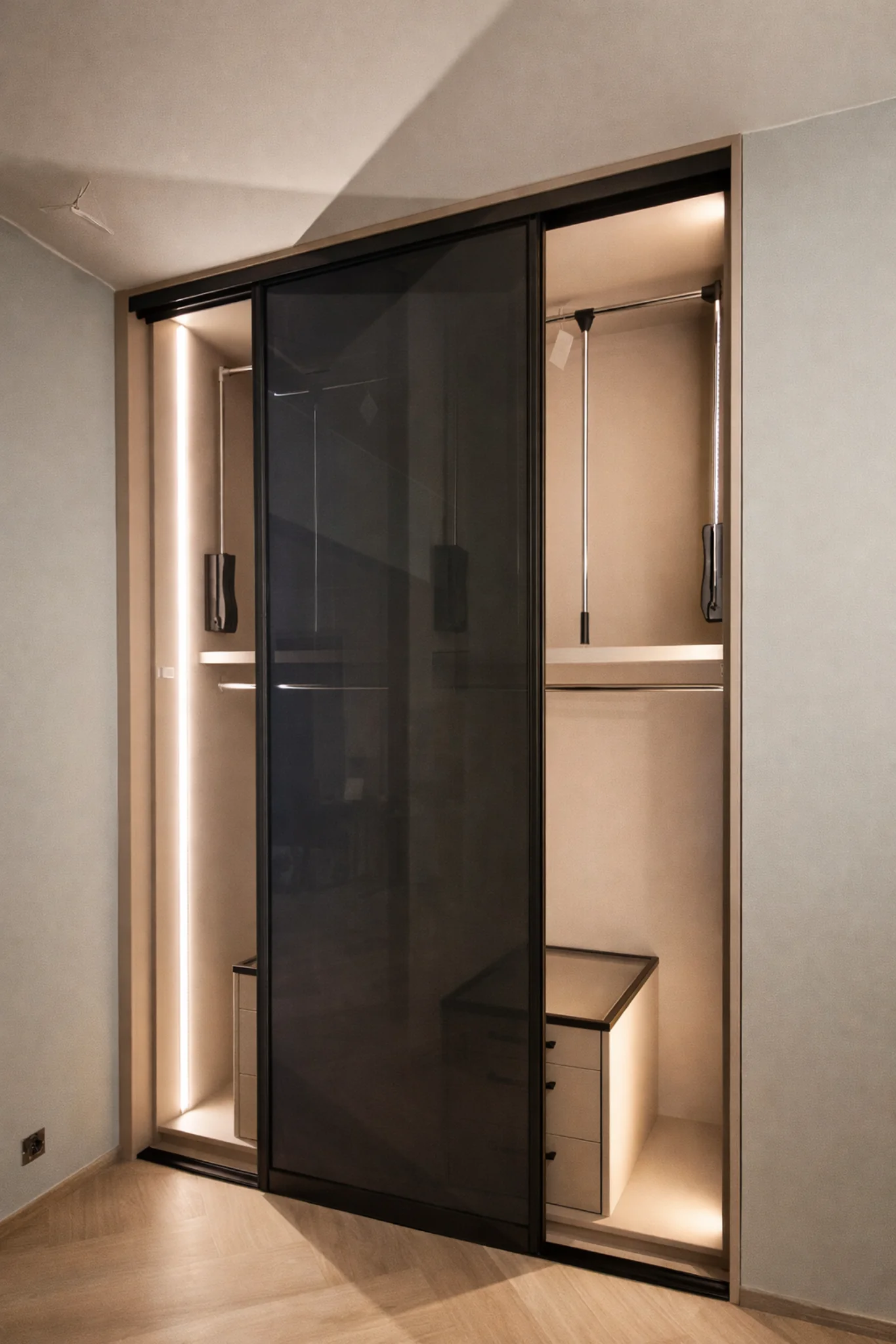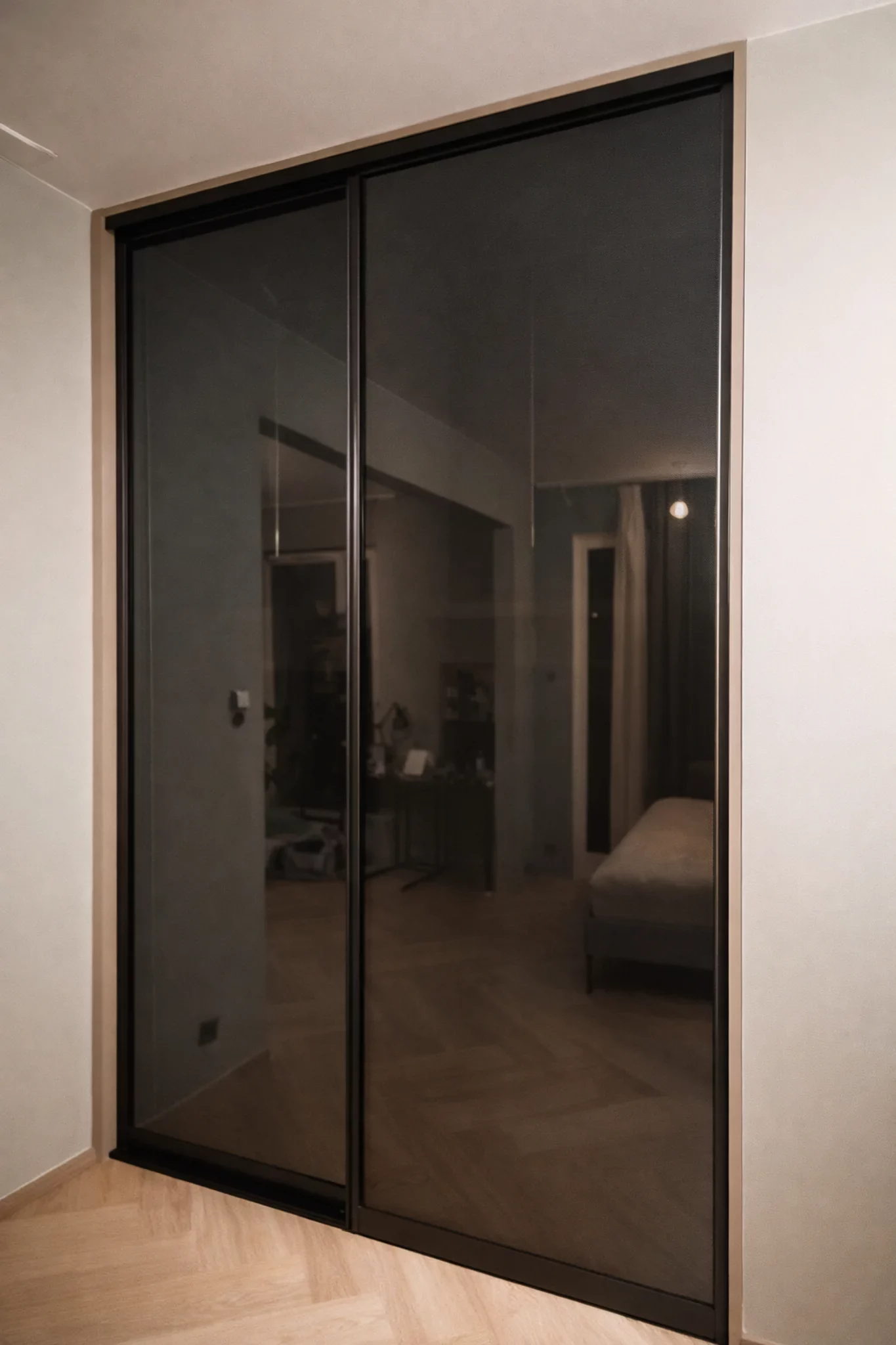 W tej realizacji zaprojektowaliśmy stylową szafę wnękową z przesuwanymi drzwiami, których fronty wypełniono przyciemnianym czarnym szkłem Antisol. To rozwiązanie łączy nowoczesny minimalizm z wysoką funkcjonalnością – ciemne szkło nadaje zabudowie eleganckiego charakteru, a jednocześnie subtelnie eksponuje jej formę.