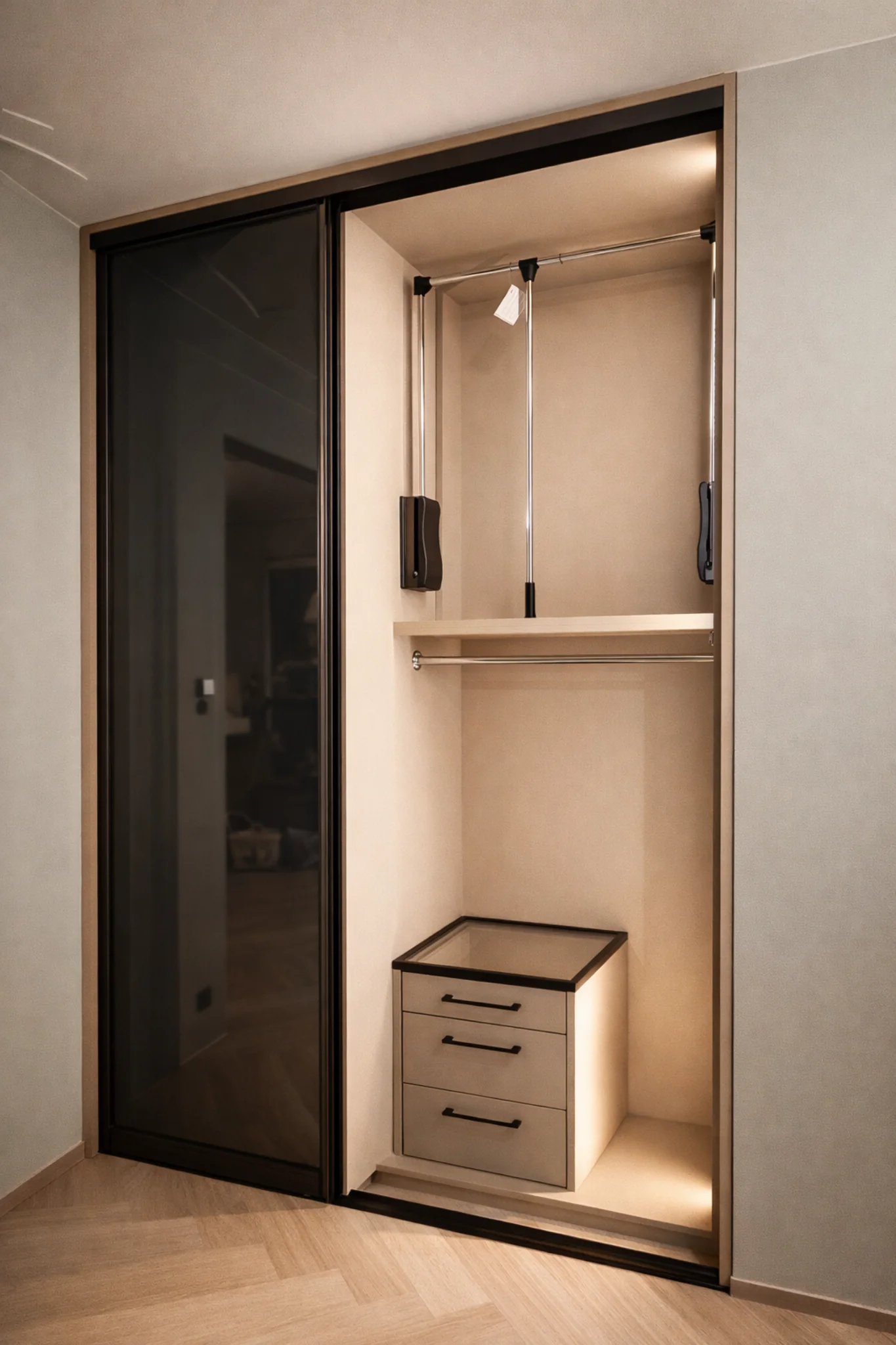 Cała realizacja pokazuje, jak połączenie szkła o przydymionym efekcie z precyzyjnie dopasowaną zabudową może podkreślić charakter wnętrza i dodać mu luksusowego wyrazu.