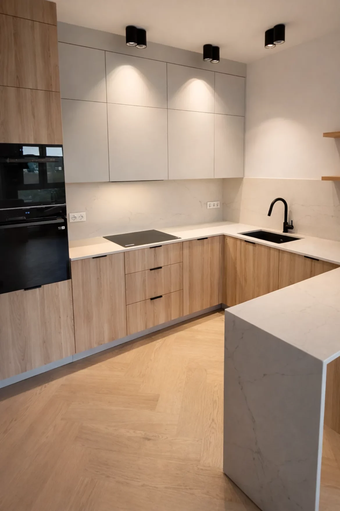 Na małej przestrzeni można sporo zmieścić. Pomijając sprzęty kuchenne mamy np. pełnowymiarowy Space Tower, kosz narożny, kosz do segregacji i 5,5 mb blatu.