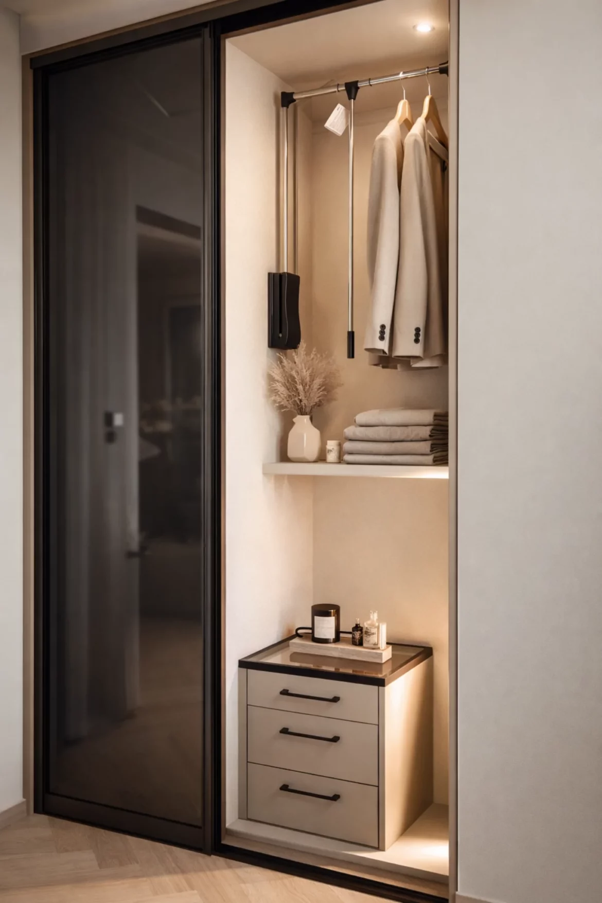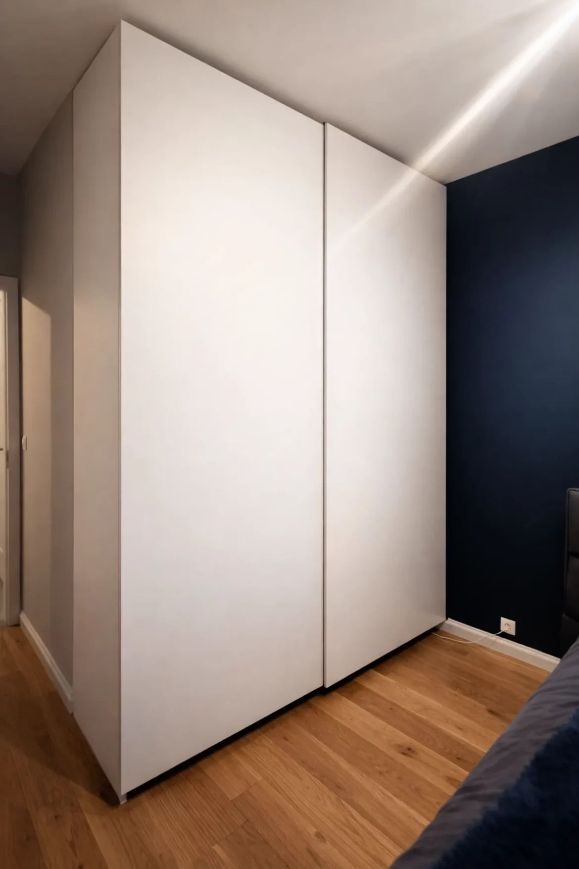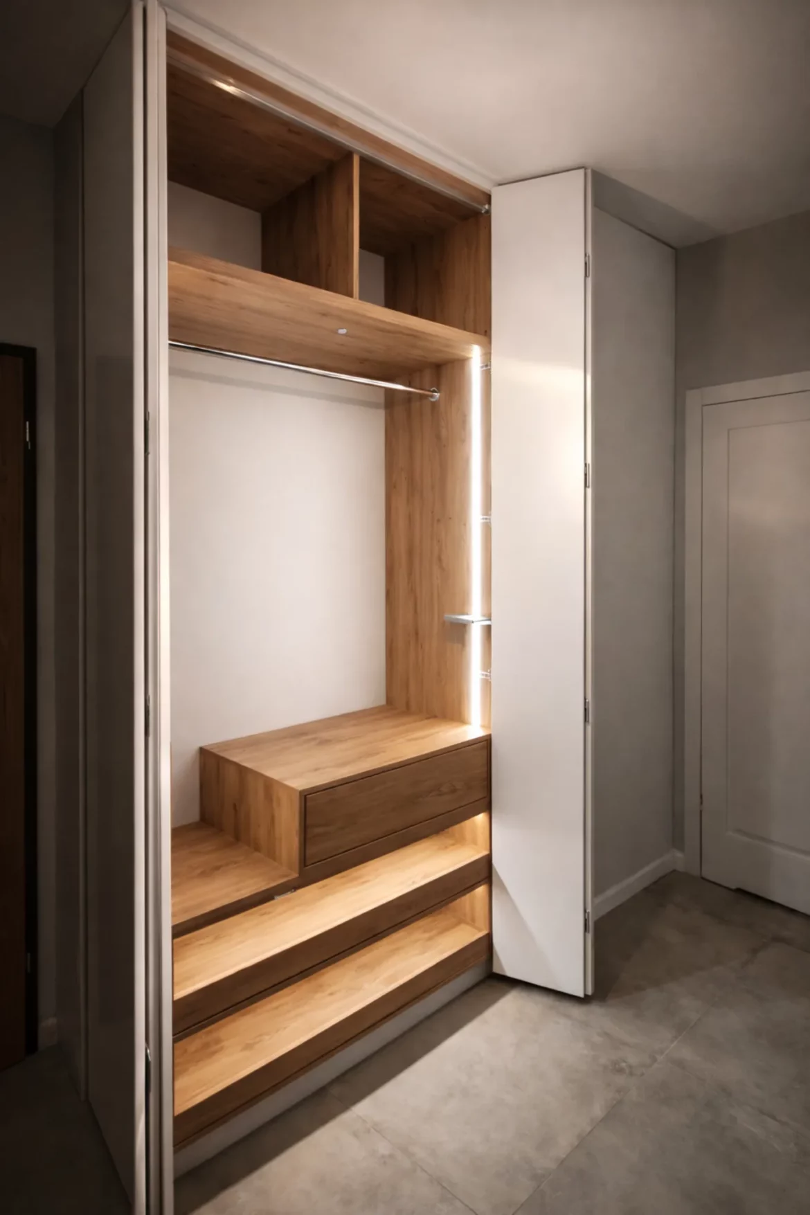 HallDodatki, SzafyCałkowita metamorfoza przedpokoju. Zabudowa pawlacza nad wejściem obłożona lakierowanym MDFem, szafka na obuwie, stalowe siedzisko z panelem tapicerowanym oraz dębowe lamele na ścianie.