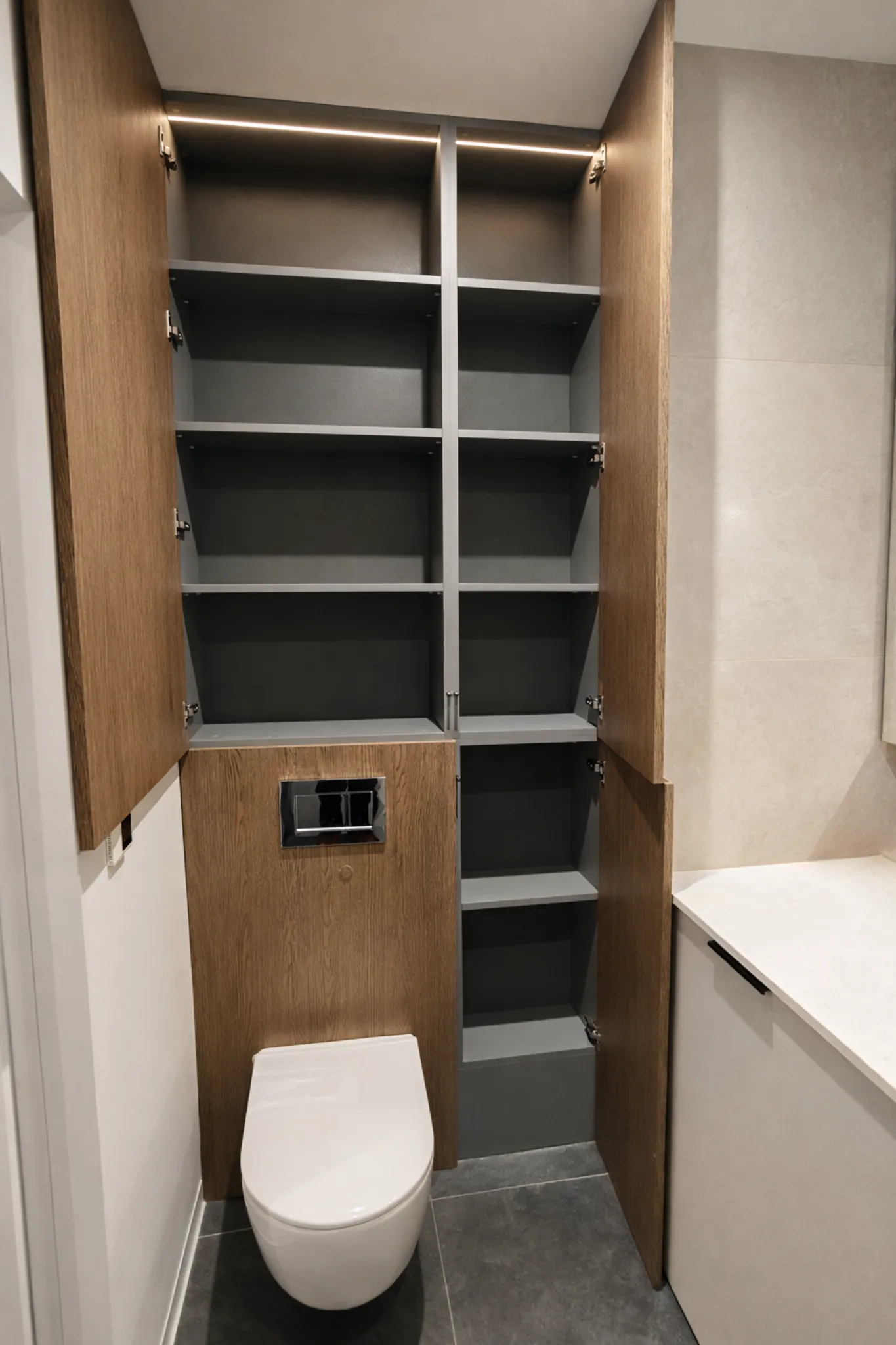 Elegancka, nowoczesna łazienka zaprojektowana z myślą o maksymalnej funkcjonalności i ponadczasowej estetyce. Zabudowa stolarska wykonana w dekorze dębu wprowadza do wnętrza ciepło naturalnego drewna, jednocześnie zachowując minimalistyczny, architektoniczny charakter. Wysoka szafka nad stelażem WC oferuje dużą przestrzeń do przechowywania, dyskretnie integrując elementy techniczne i porządkując przestrzeń.