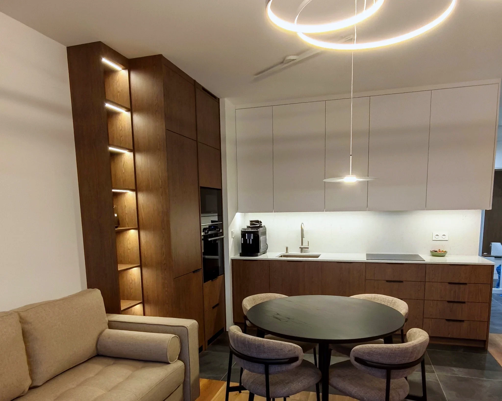 Starannie zaprojektowana zabudowa wysoka z podświetlanymi wnękami, zintegrowane sprzęty oraz funkcjonalny układ roboczy zapewniają maksymalny komfort użytkowania. Całość dopełniają kamienne blaty, nowoczesne oświetlenie i spójna strefa jadalniana, tworząc reprezentacyjną przestrzeń do codziennego życia.