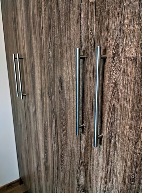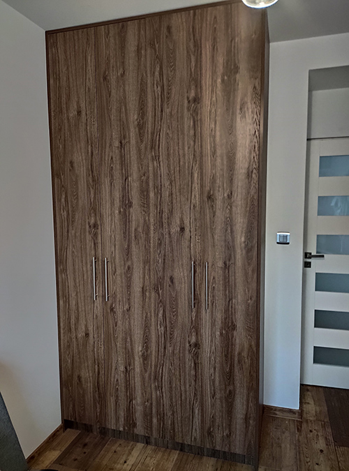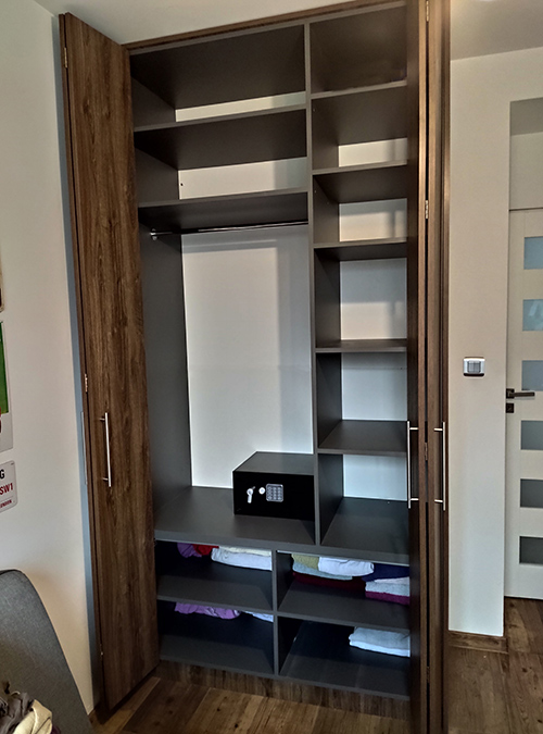 Szafa dwudrzwiowa w systemie drzwi łamanych. Rozwiązanie takie zabiera dużo mniej miejsca niż drzwi przesuwane. Szczególnie polecane jest do przestrzeni, gdzie nie mamy zbyt dużo powierzchni na pełne otwarte skrzydła. Dodatkowo po otwarciu cała zawartość szafy jest w pełni dostępna.