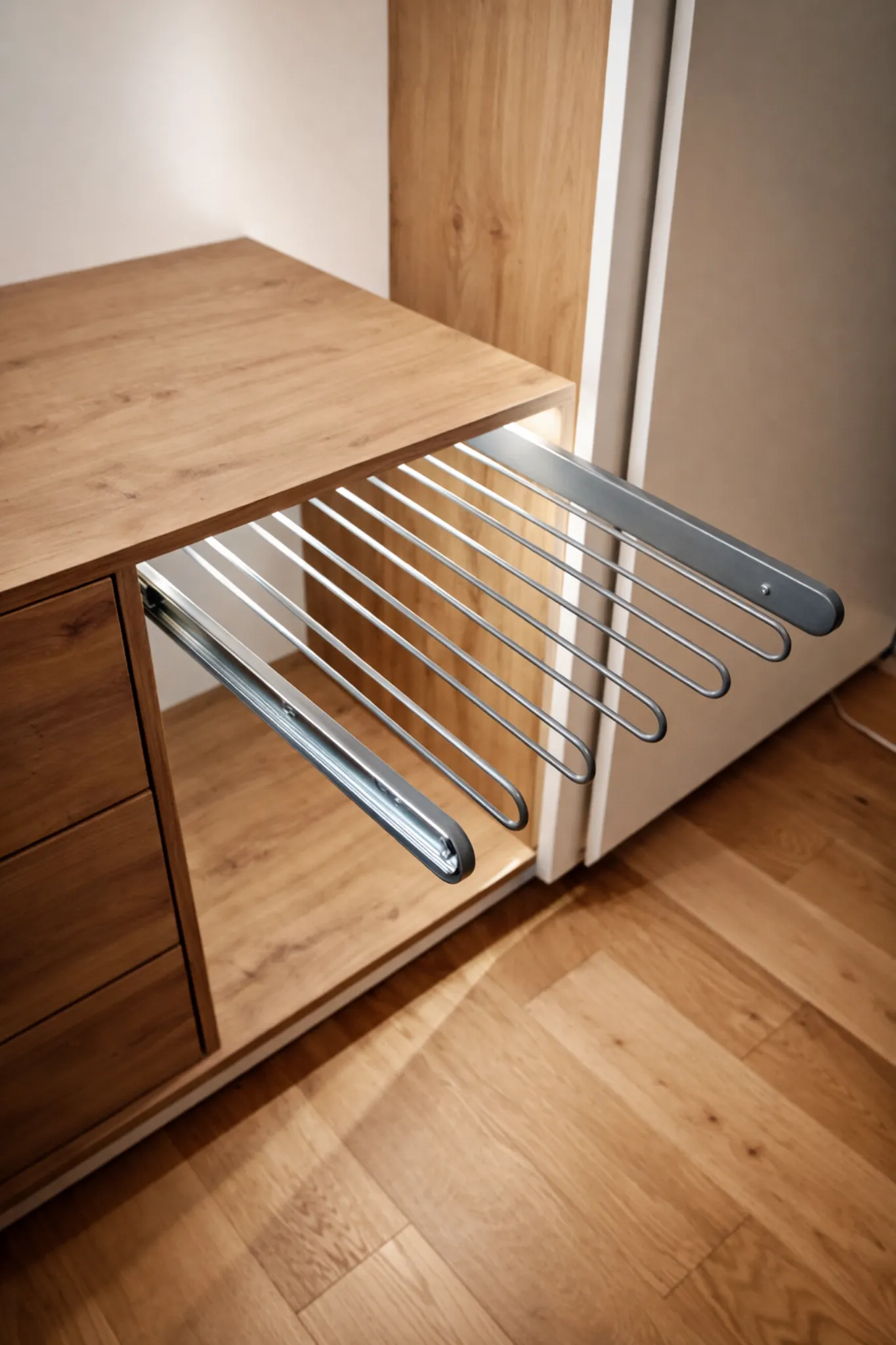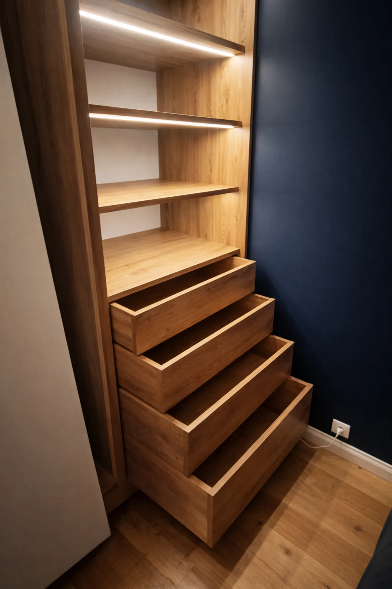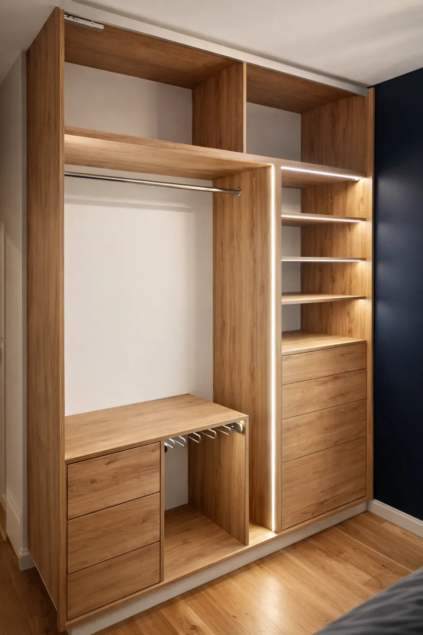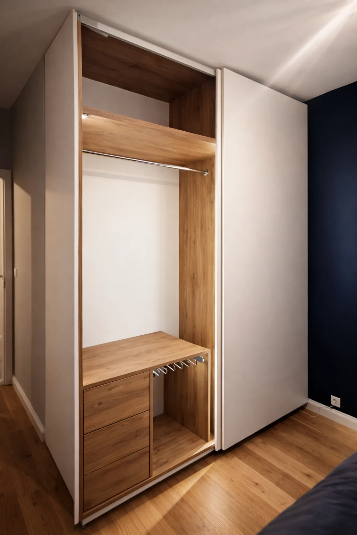 Pojemna szafa narożna z przesuwanymi drzwiami o wymiarach 180 x 265 x 65 cm z automatycznym oświetleniem LED. Wnętrze szafy stanowi drewnopodobna płyta meblowa, drzwi i widoczny bok przykrył MDF lakierowany na biały półmat (RAL 9016).