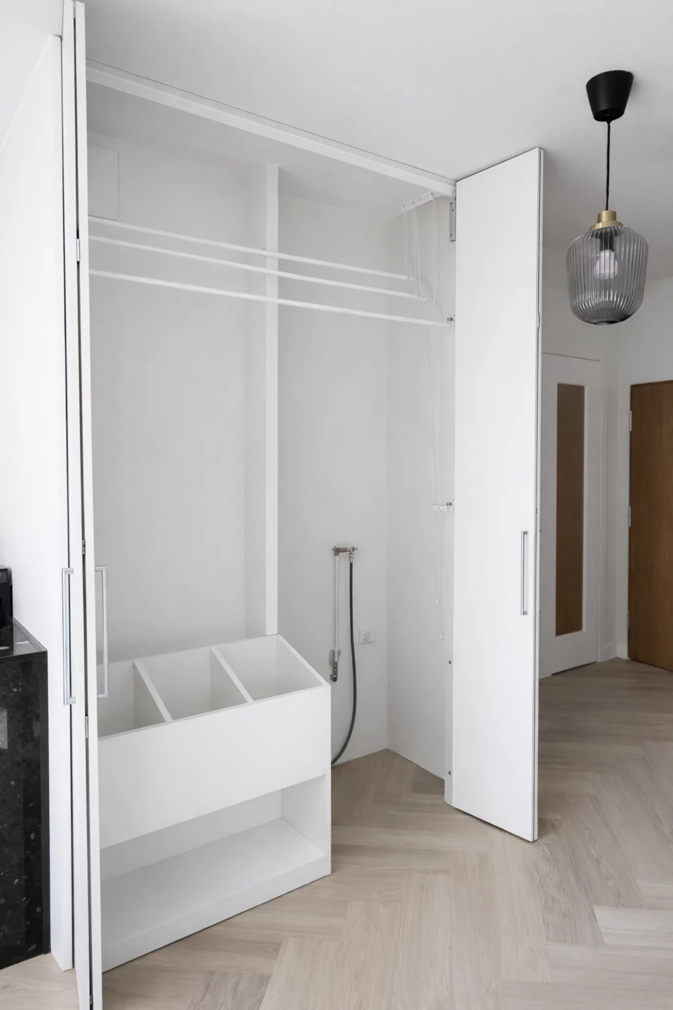 Drzwi pełnią funkcję eleganckiej przegrody oddzielającej korytarz od przestrzeni przeznaczonej na pranie i suszenie. Po zamknięciu tworzą spójną, gładką ścianę, doskonale wpisującą się w nowoczesne wnętrza. Po otwarciu zapewniają pełen dostęp do zabudowy technicznej, bez zajmowania dodatkowej przestrzeni.