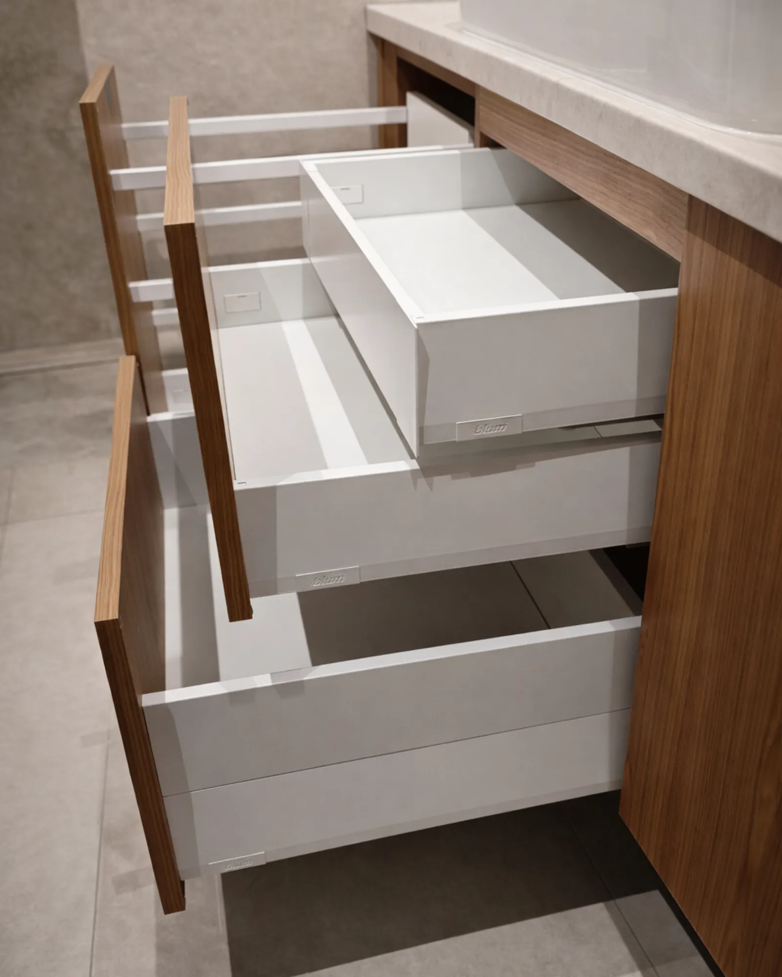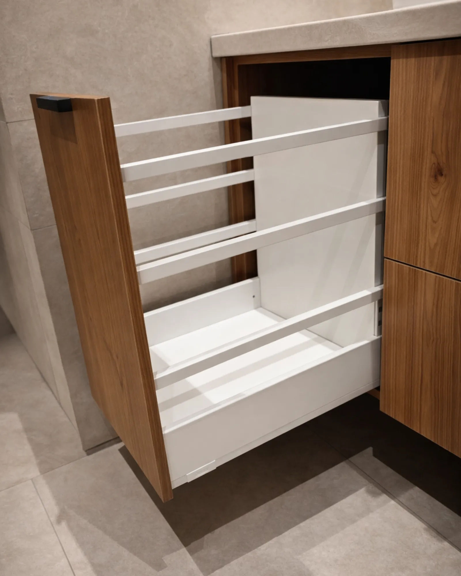 Minimalistyczne, czarne uchwyty podkreślają nowoczesną formę mebla i nadają mu wyrazistego akcentu. Pojemne szuflady z pełnym wysuwem zapewniają wygodny dostęp do zawartości, a zastosowane systemy cichego domyku gwarantują komfort użytkowania i płynną pracę każdego dnia.