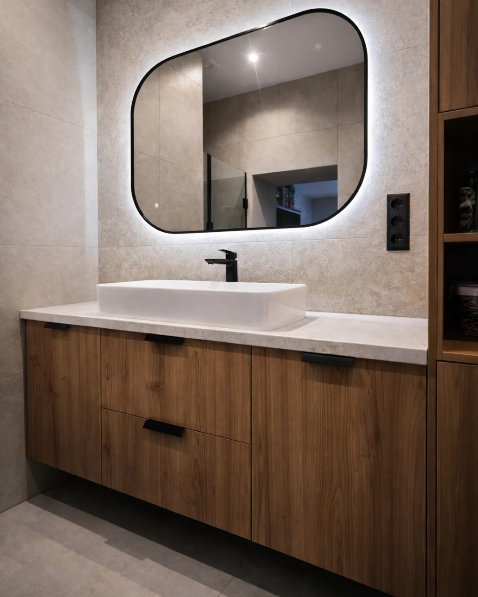 Prezentowana zabudowa łazienkowa łączy nowoczesną estetykę z dopracowaną funkcjonalnością. Ciepły dekor drewna wprowadza do wnętrza naturalny charakter i doskonale kontrastuje z jasnymi, kamiennymi powierzchniami, tworząc spójną i elegancką całość.