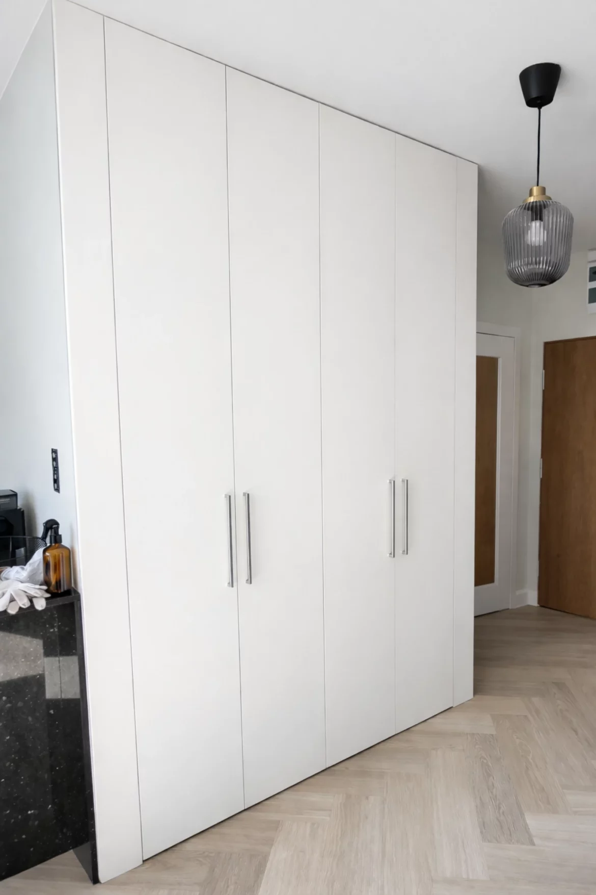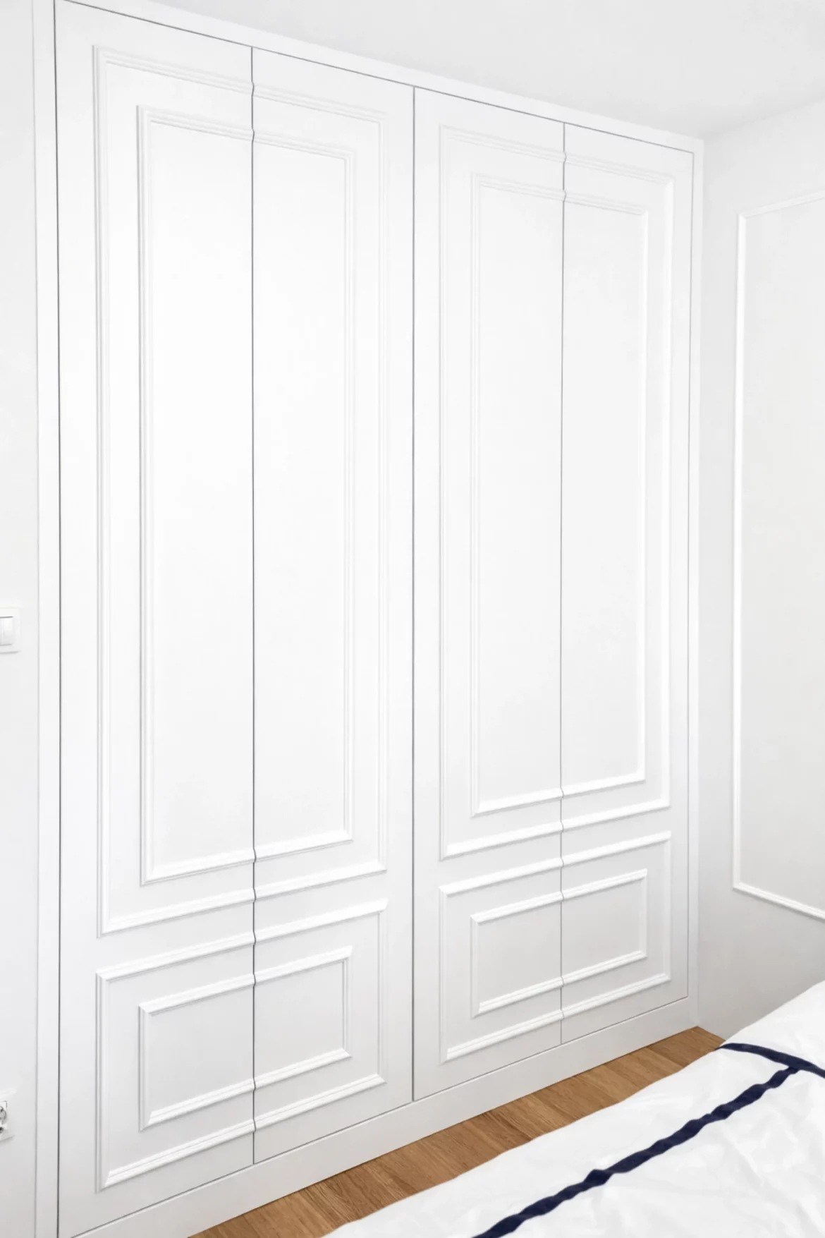 Witryny wykonane z płyty laminowanej Egger Dąb Halifax. Fronty szklane w profilach aluminiowych, lustra grafitowe.